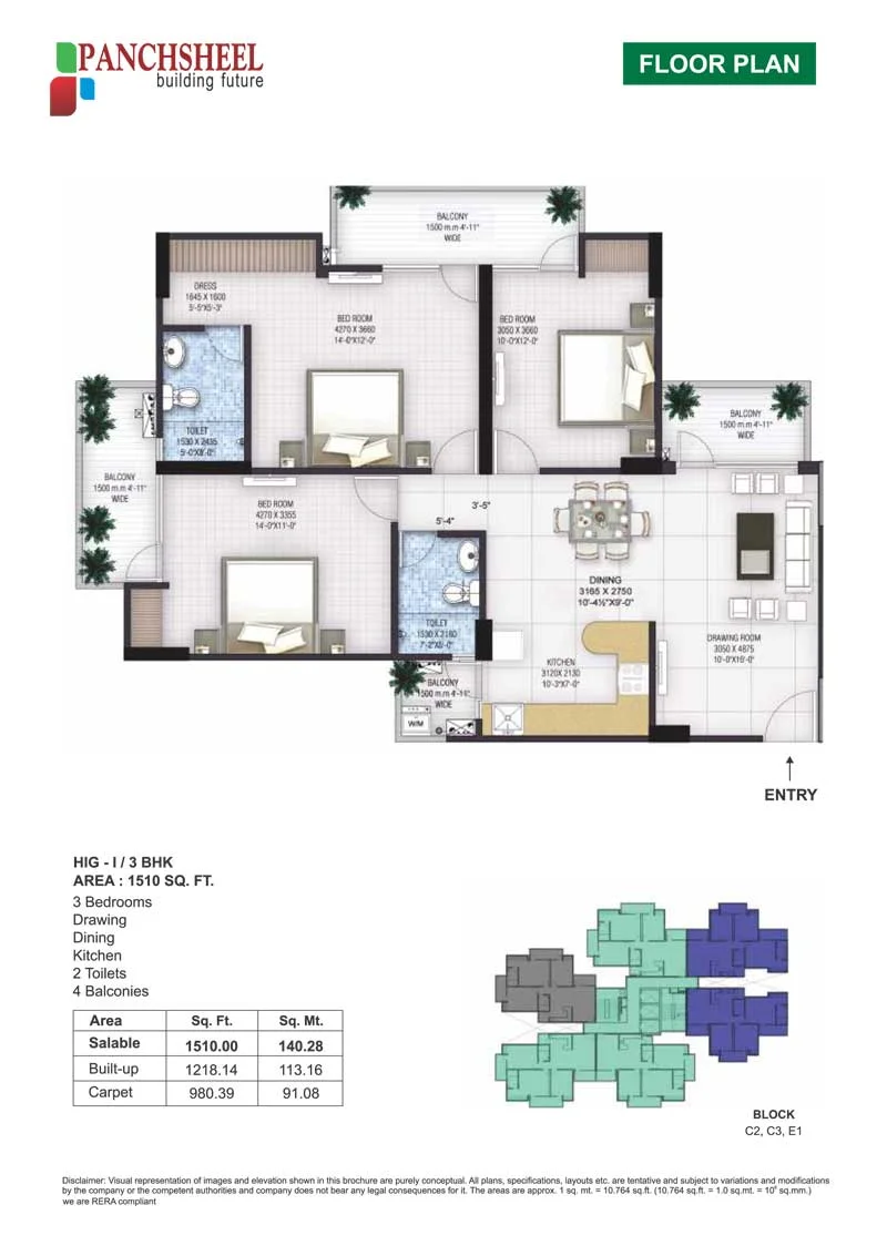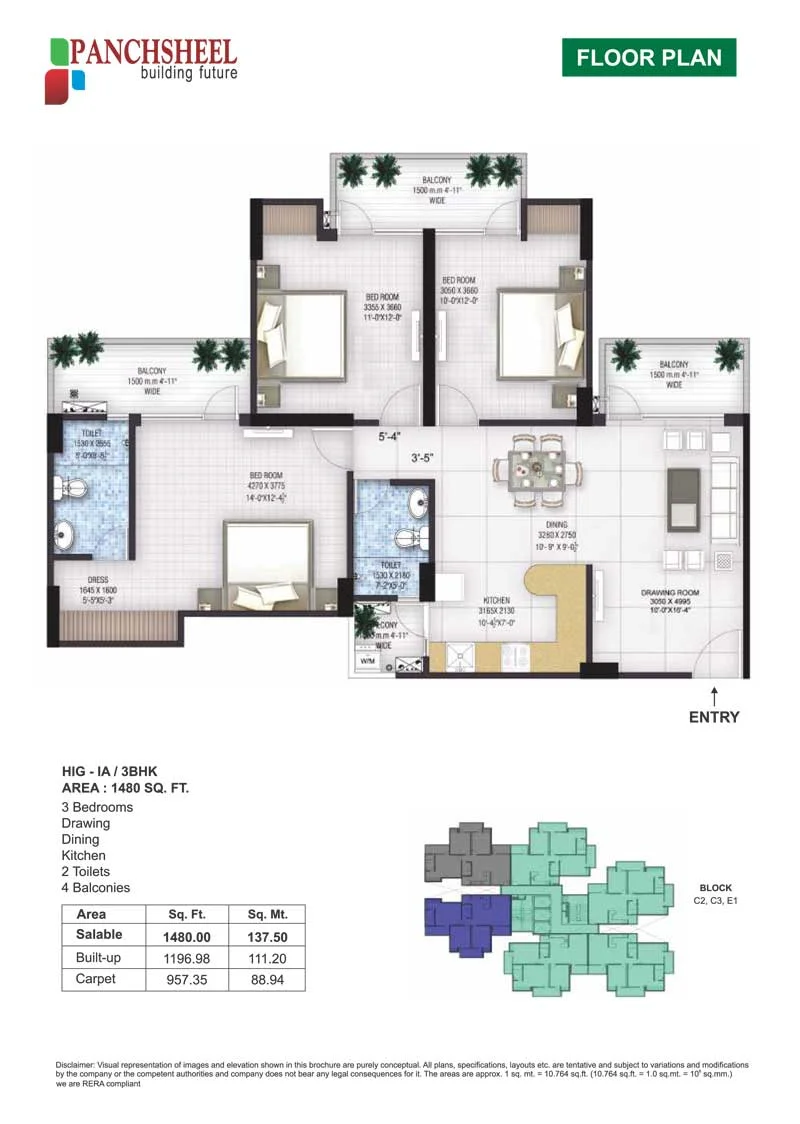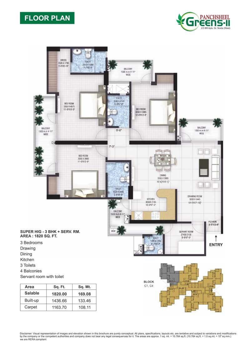 The Panchsheel Greens 2 Floor Plan states that the MIG-II/2 BHK-1105 Sq. ft., MIG-III/2 BHK + Study-1350 Sq. ft., and HIG-IA/3 BHK-1480 Sq. ft. are all large residences on the Panchsheel Greens 2 property. For an ideal and luxurious lifestyle, it has also offered residences like Super HIG-I -3 BHK Servant Room-1820 Sq. ft. and HIG-I /3 BHK-1510 Sq. ft. The development's architects and designers have worked tirelessly to create the ideal area in the hearts of the locals.